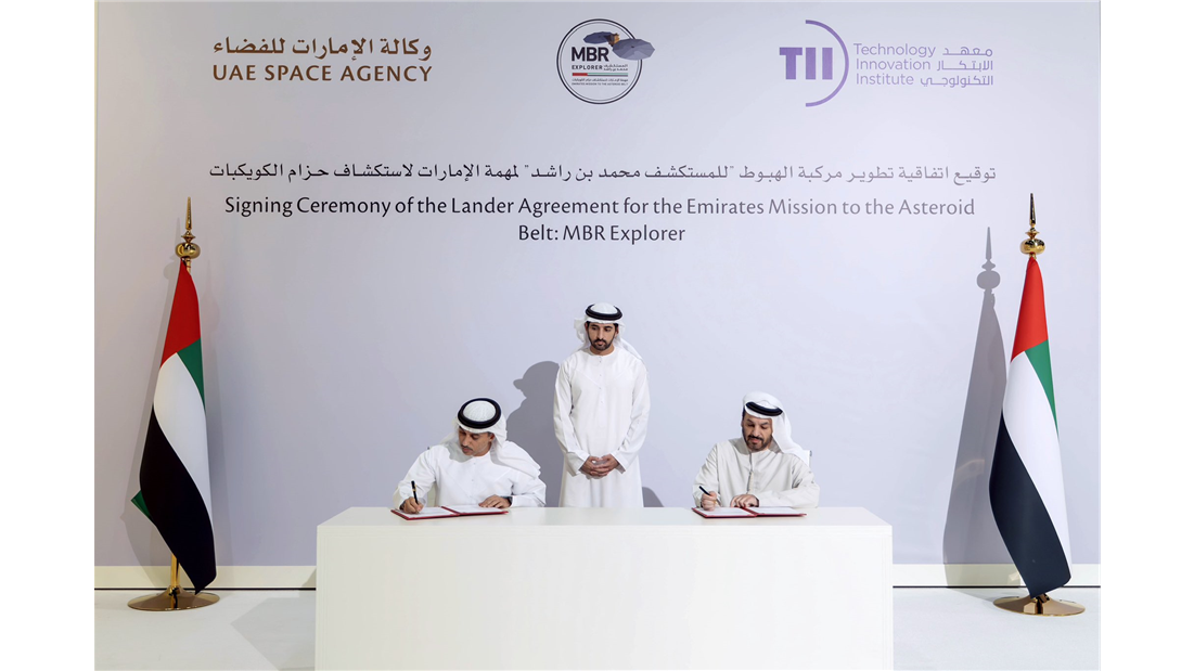 بحضور سمو الشيخ حمدان بن محمد بن راشد آل مكتوم، ولي عهد دبي نائب رئيس مجلس الوزراء وزير الدفاع، رئيس المجلس الأعلى للفضاء، وقعت وكالة الإمارات للفضاء ومعهد الابتكار التكنولوجي TII، اتفاقية تعاون، لتصميم وتصنيع مركبة الهبوط على كويكب «جوستيشيا»، والتي ستكون على متن المستكشف محمد بن راشد الخاص بمهمة الإمارات لاستكشاف حزام الكويكبات.