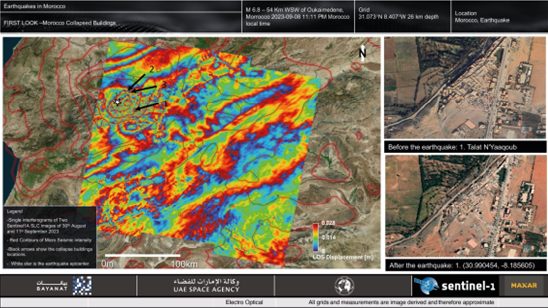 انطلاقا من إيمان وكالة الإمارات للفضاء بأهمية التعاون الدولي والتكاتف الإنساني في مواجهة الكوارث الطبيعية، ساهم فريق مشروع «منصة تحليل البيانات الفضائية» التي تندرج ضمن مشروع «مجمع البيانات الفضائية» وبالتعاون مع شركة «بيانات»، في تقديم عدد من تقارير التحليلات التي نُشرت عبر موقع الميثاق الدولي "للفضاء والكوارث الكبرى “كجزء من الجهود الدولية في إدارة أزمة زلزال دولة المغرب الشقيقة.