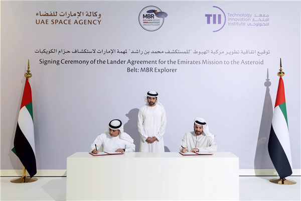 In the presence of His Highness Sheikh Hamdan bin Mohammed bin Rashid Al Maktoum, Crown Prince of Dubai, Deputy Prime Minister and Minister of Defence of the UAE, and Chairman of the Supreme Space Council, the UAE Space Agency and the Technology Innovation Institute (TII) signed an agreement to design and develop the EMA Lander which will be aboard the MBR Explorer, and will be deployed to study the 7th asteroid Justitia, as part of the Emirates Mission to the Asteroid Belt (EMA).