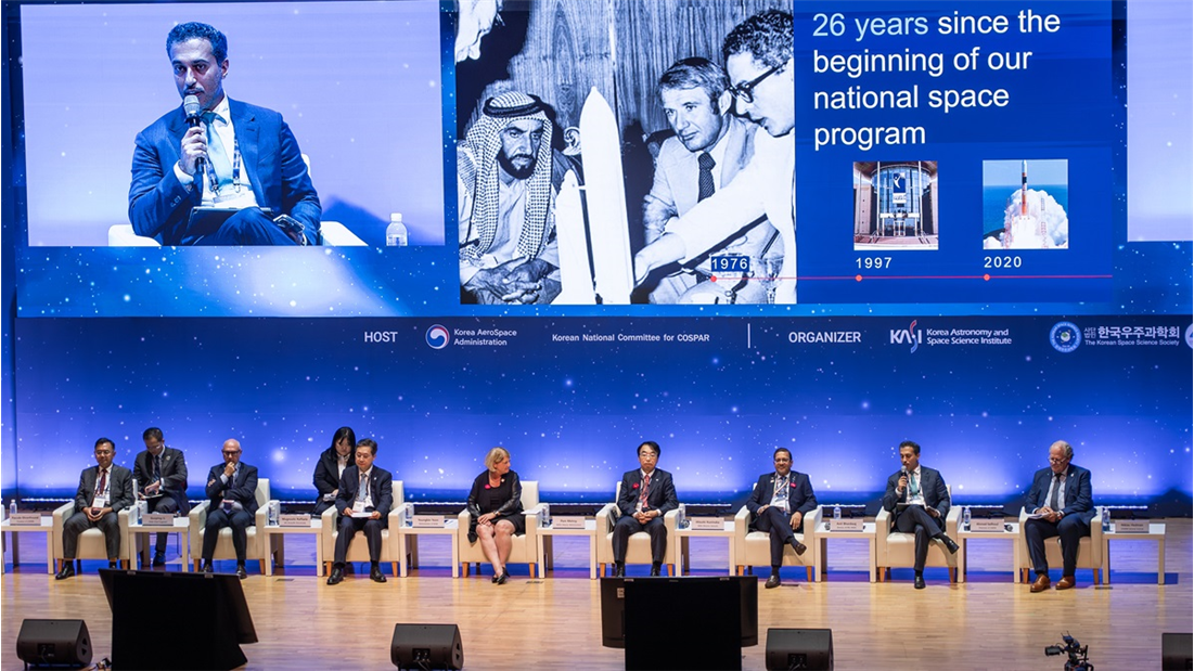 His Excellency Dr. Ahmad Belhoul Al Falasi participated in a panel discussion held on the sidelines of the conference. The discussion was hosted by Professor Young-bin Yoon, President of the Korea AeroSpace Administration (KASA); Dr. Anil Bhardwaj, Director of Physical Research Laboratory (PRL); Li Guoping, Chief Engineer of the China National Space Administration (CNSA); Hitoshi Kuninaka, Director General of the Institute of Space and Astronautical Science (ISAS); Pam Melroy, Deputy Administrator at NASA; and Mugnuolo Raffaele, Head of Exploration, Infrastructures, and Scientific Satellite Department at the Italian Space Agency (ASI). The panel was moderated by Pascale Ehrenfreund, President of COSPAR and Niklas Hedman, Acting Director of the United Nations Office for Outer Space Affairs (UNOOSA).